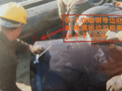 ( 3 ) 固定卡箍按照30公分距離捆扎,澆筑時(shí)由于柱子底部承受的壓力最大可適當(dāng)加密卡箍,上部壓力很小可適當(dāng)加大卡箍距離,如圖所示最下端一根鋼帶一定要緊貼模板下邊緣,不能過(guò)高,最大距離不能大于1公分