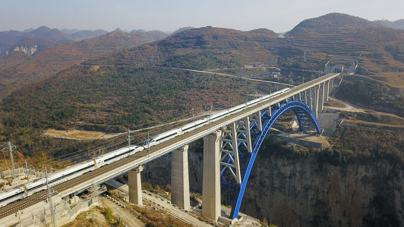 12月16日,一列動車組列車從成貴高鐵西溪河大橋上駛過(無人機(jī)拍攝)